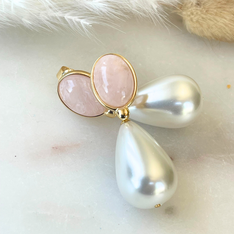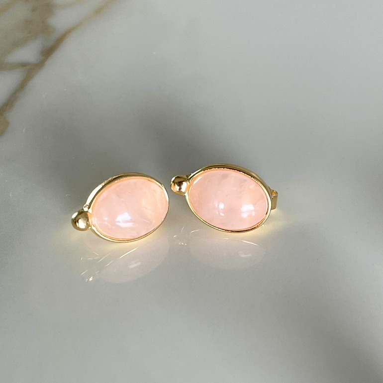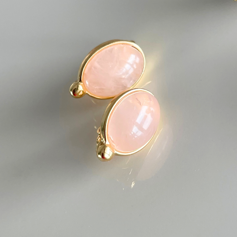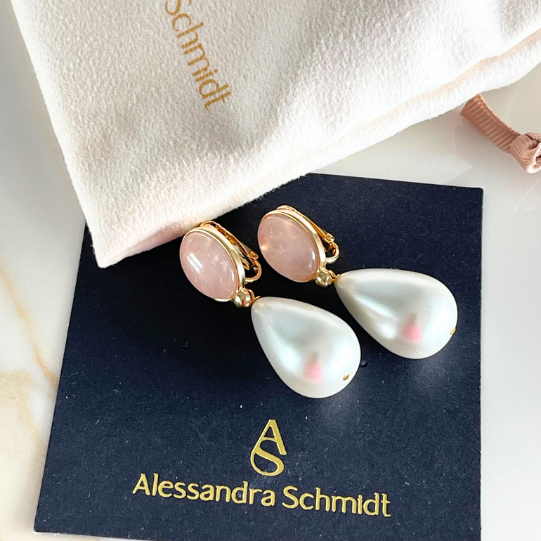 Am Morgen trägst Du die Clip-Ohrringe schlicht und pur – nur mit der ovalen Basis aus poliertem Rosenquarz. Am Abend verwandeln sie sich mit den edlen Shell-Perlen in einen femininen, sanft schimmernden Akzent – perfekt für ein Dinner, ein Konzert oder den Apéro im Museum.