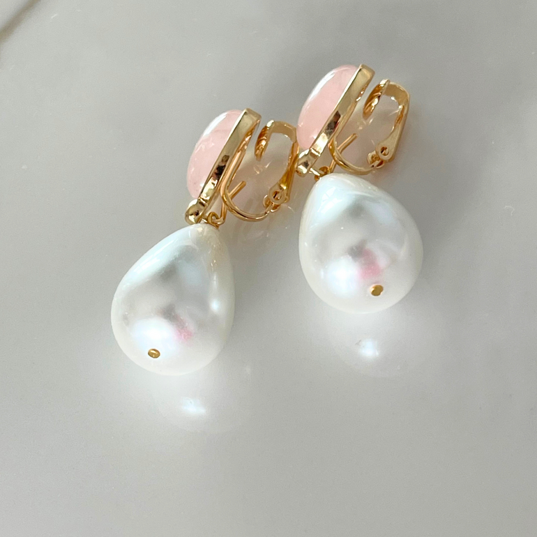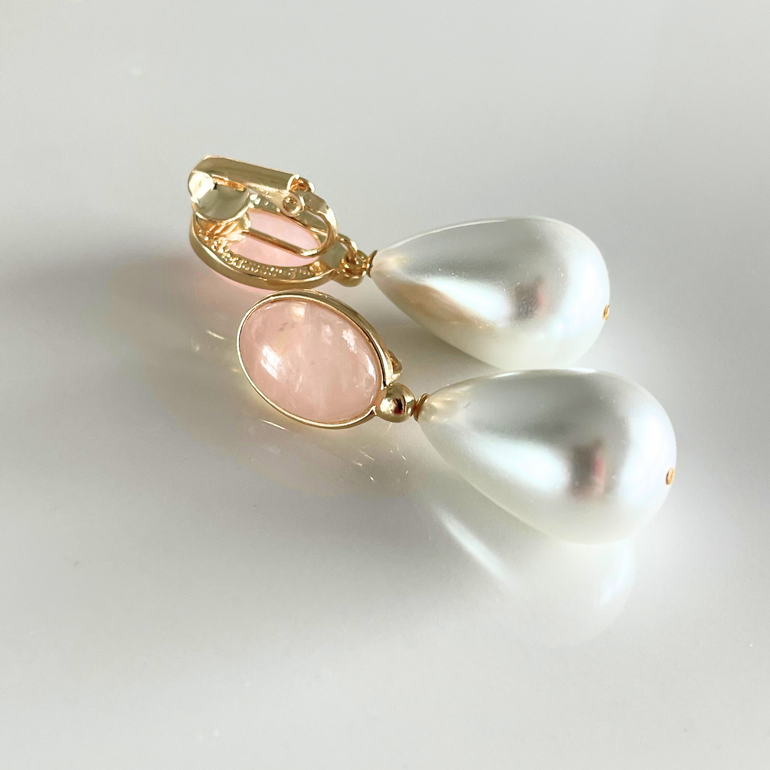 Clip-Ohrringe AMÉLIE mit Rosenquarz & Shell-Perlen – 2-in-1: mit oder ohne Anhänger tragbar. Elegant, wandelbar & stilvoll.