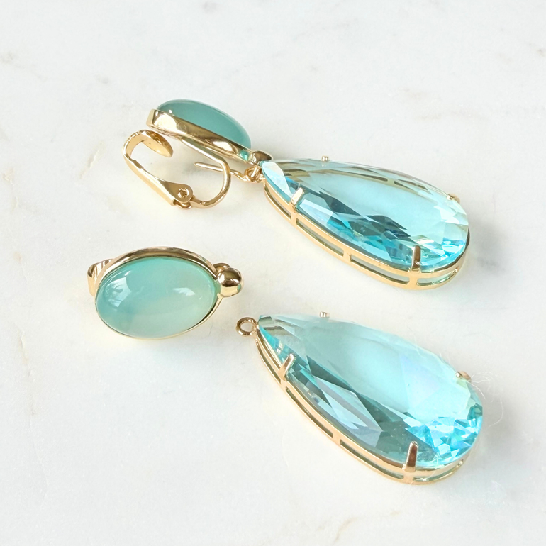 Die zartblaue Basis bringt Ruhe und Klarheit, während der facettierte Anhänger in Aquaton einen eleganten Glanz entfaltet. Ein Ohrschmuck, der an Licht, Wasser und weiche Bewegung erinnert.