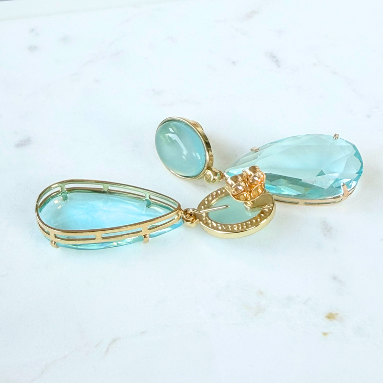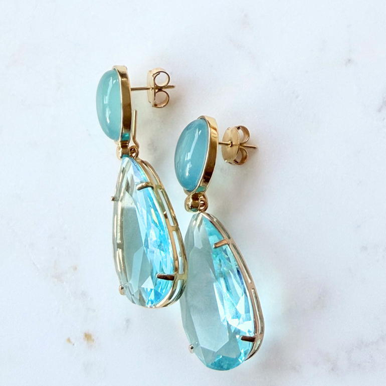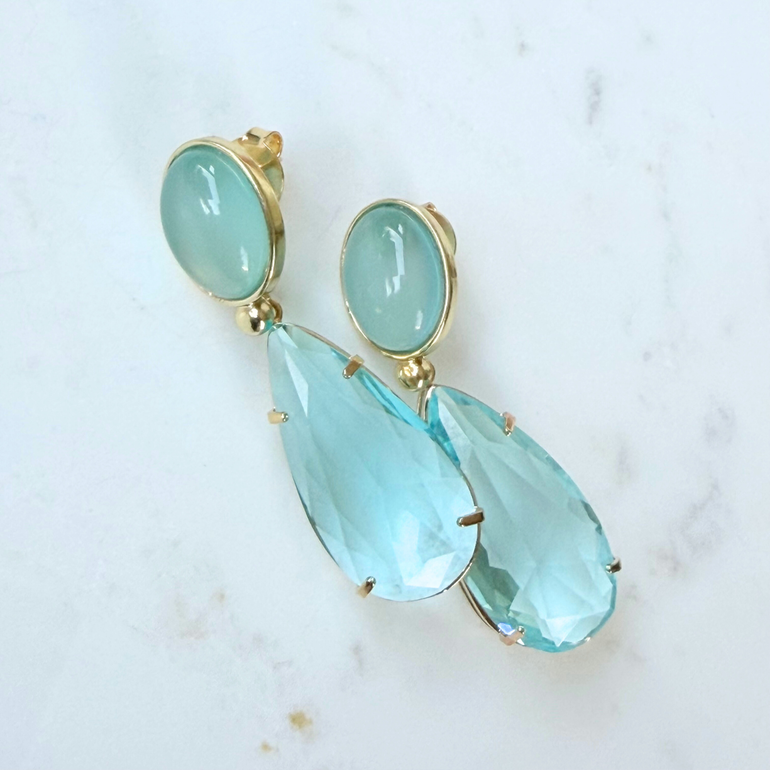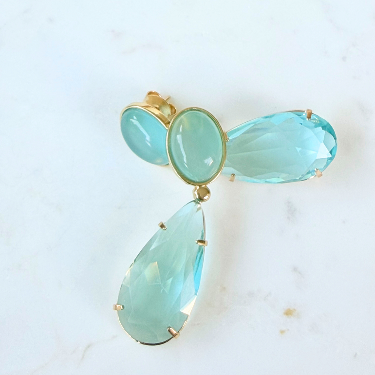 Die zartblaue Basis bringt Ruhe und Klarheit, während der facettierte Anhänger in Aquaton einen eleganten Glanz entfaltet. Ein Ohrschmuck, der an Licht, Wasser und weiche Bewegung erinnert.