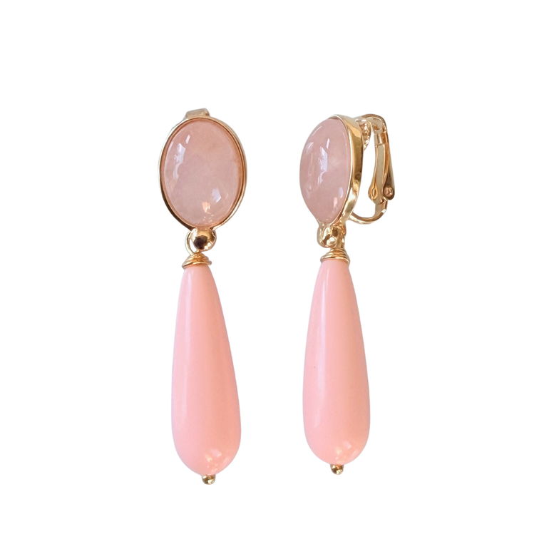 Clip Ohrringe NOÉMIE mit Rosenquarz und Tropfen aus Korallenpaste mit oder ohne Anhänger tragbar