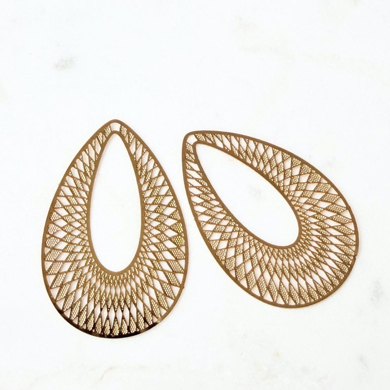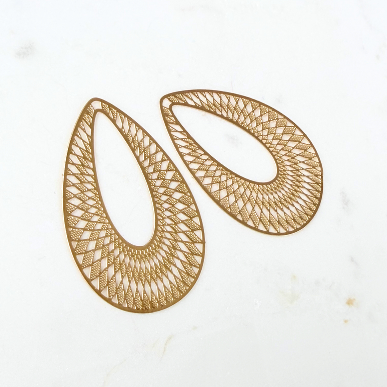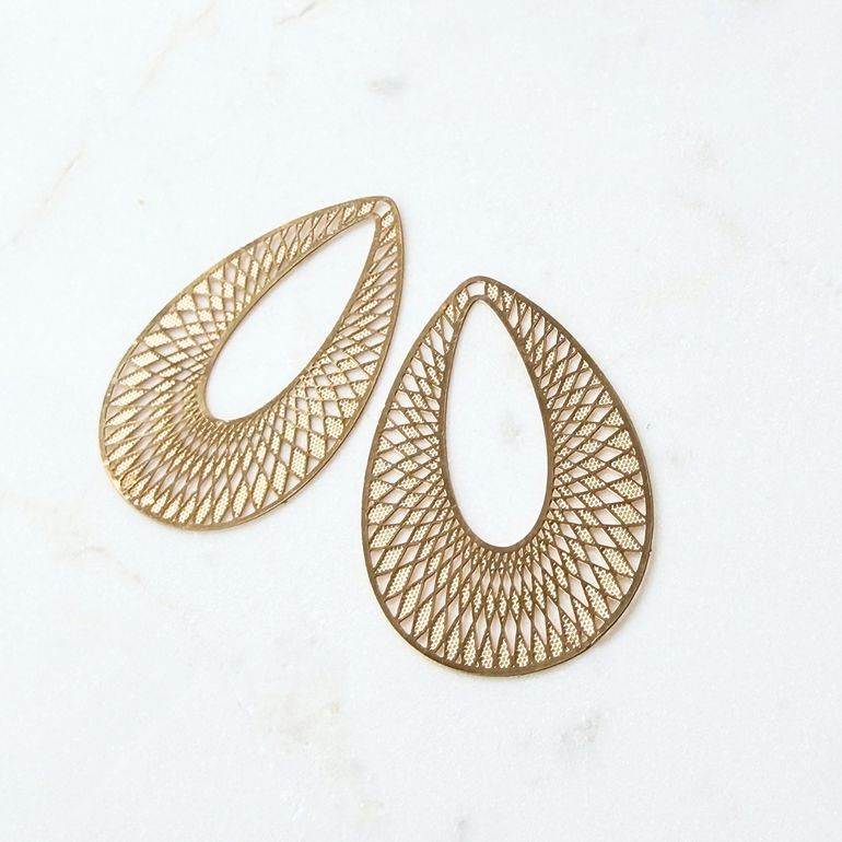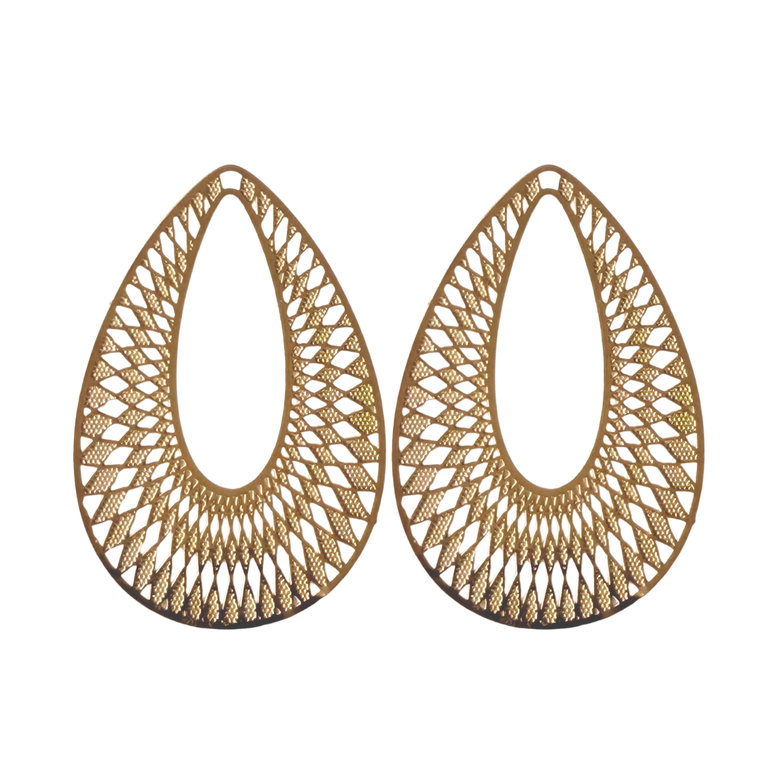 Leichtgewichtige Anhänger aus goldfarben vergoldetem Edelstahl in filigraner Tropfenform.