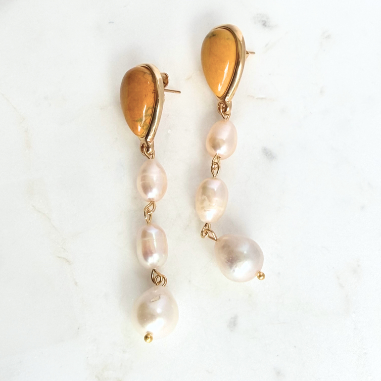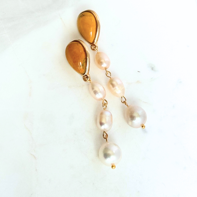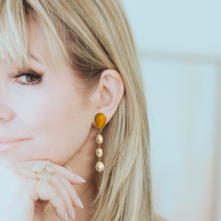 Der warme Gelbton des Steins trifft auf den sanften Schimmer der Perlen und schafft eine harmonische Balance zwischen Eleganz und Leichtigkeit. MARGIT wirkt präsent und feminin, ohne überladen zu sein.