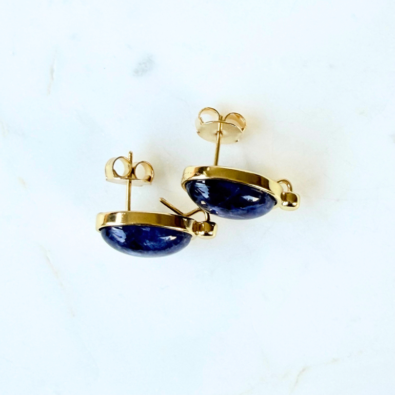 Die natürlich gemaserte Basis wirkt ruhig und kraftvoll, während der glatt geschliffene Anhänger in Lapislazuli Tiefe und eine subtile Goldschimmer Note entfaltet. Ein Ohrschmuck, der an nächtlichen Himmel, stille Weite und sanfte Bewegung erinnert.