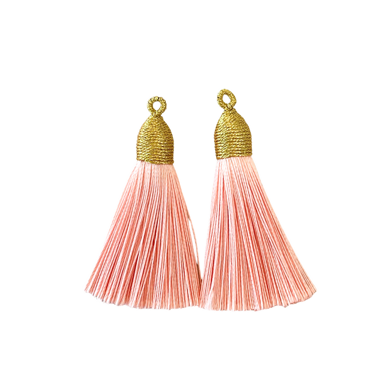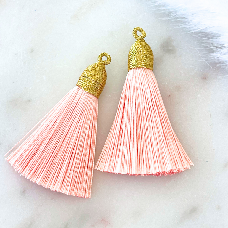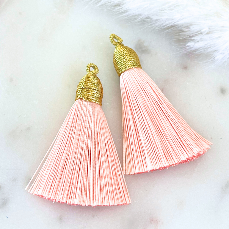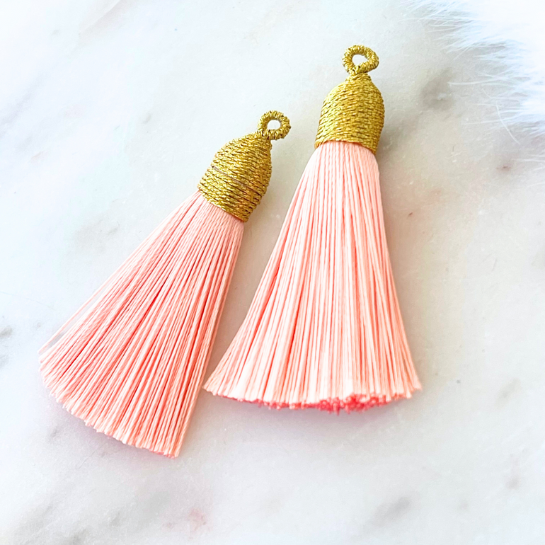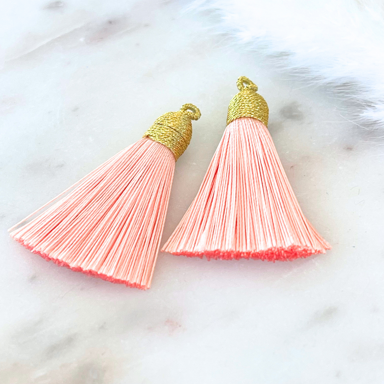Quastenanhänger aus lachsrosa Baumwolle, passend für Wechselsystem-Ohrringe.